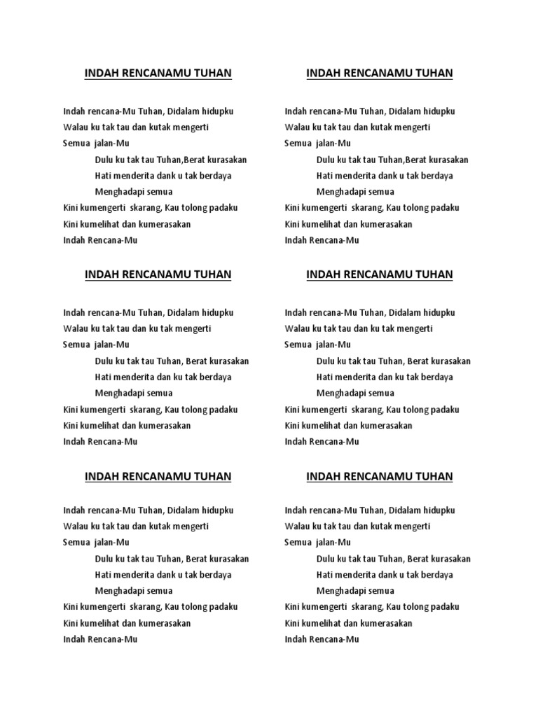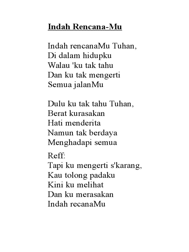 Indah rencana mu tuhan Indah rencanaMu Tuhan Di dalam hidupku walau ku tak tau Dan ku tak mengerti semua jalanMu Dulu ku tak tau Tuhan Berat ku rasakan hati menderita Dan ku tak berdaya Menghadapi semua REFF Tapi ku mengerti sekarang Kau tolong padaku Kini ku melihat dan ku merasakan Indah rencanaMu kembali ke reff. Tuhan kupercaya rencanaMu indah. Ku tahu rencanaMu indah bagiku Ku tahu kehendakMu baik bagiku Ku tahu rancanganMu sempurna bagiku Ku tahu jalan-jalanMu yang terbaik bagiku.