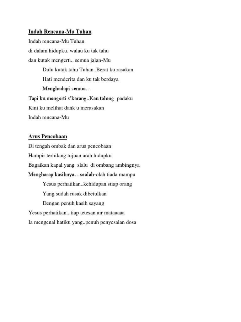 Lirik lagu indah rencanamu tuhan. Lirik lagu rohani indah rencanamu indah rencanamu tuhan di dalam hidupku walau ku tak tahu dan ku tak mengerti semua jalanmu dulu ku tak tahu tuhan berat kurasakan hati menderita dan ku tak berdaya menghadapi semua tapi ku mengerti skarang kau tolong padaku kini ku melihat dan ku merasakan indah rencanamu tapi ku mengerti skarang kau tolong padaku. Meski kadang kita tidak mengerti akan rencanaNya Namun kita tetaplah akan beroleh hikmat dan anugrah yang telah disediakan bagi setiap orang yang percaya dan mengasihi Dia. Ku tahu kehendakMu baik bagiku.