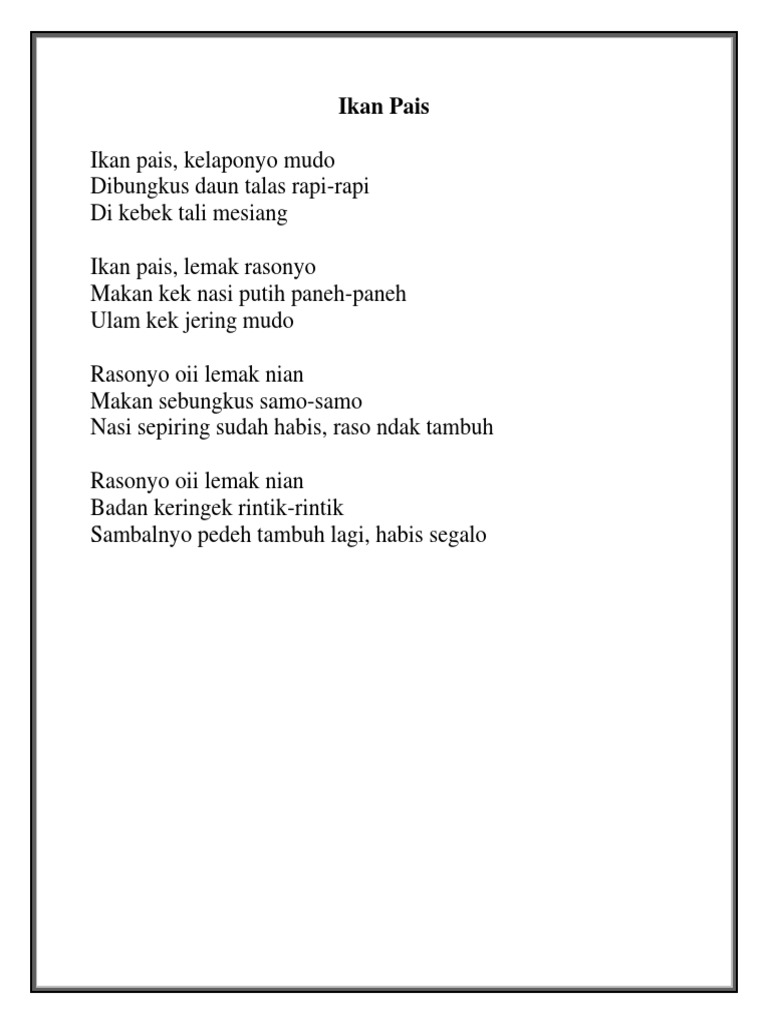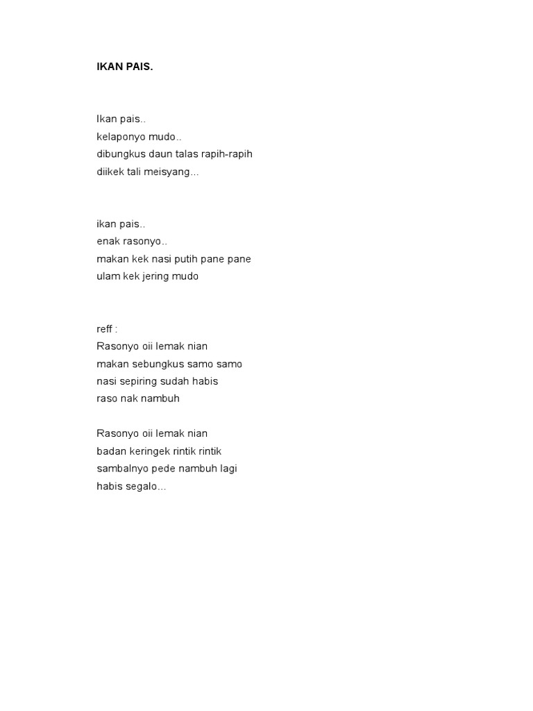 Makan kek nasi putih paneh-paneh. Ikan Pais lagu daerah BengkuluLirikIkan paisKelapo nyo mudoDibungkus daun talas rapi rapiDikebek tali mesiangIkan pais Lemak raso nyoMakan kek nasi putih. Selain itu ada audiovideo lagu tersebut untuk mendengar melodi lagunya.
