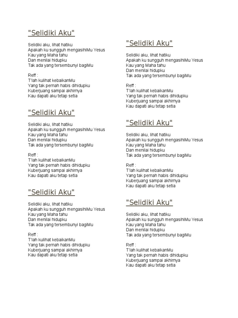 Lirik dan Chord Lagu Selidiki Aku - True Worshipers. A Ujilah Aku Tuhan D E A Cobalah Aku Tuhan D ED Cm Fm Selidiki Batinku Dan Hatiku Bm E A DA Mataku Tertuju PadaMu A E A Aku Cinta PadaMu Tuhan D E A Aku Rindu HadiratMu Tuhan D ED Cm Fm Aku Ingin Selalu Dekat PadaMu Bm E A E Menikmati KehadiranMu Reff. Selidiki Aku Chord lirik lagu kunci gitar chord cord pujian rohani pujian kristen.
